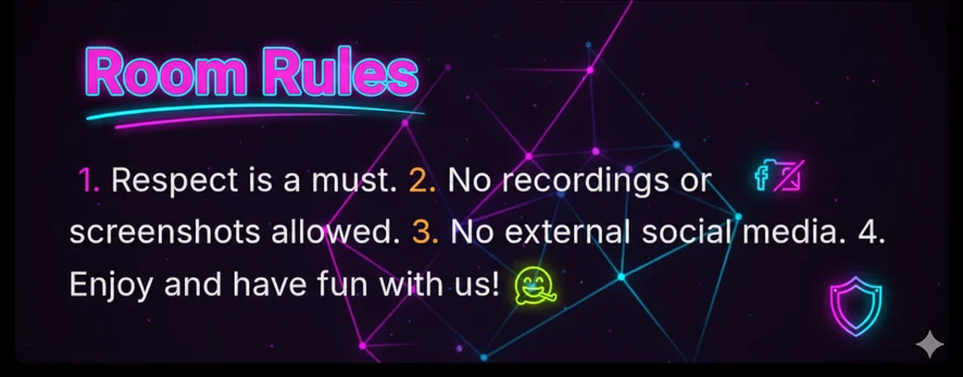1. Respect is a must. 2. No recordings or screenshots allowed. 3. No external social media. 4. Enjoy and have fun with us!