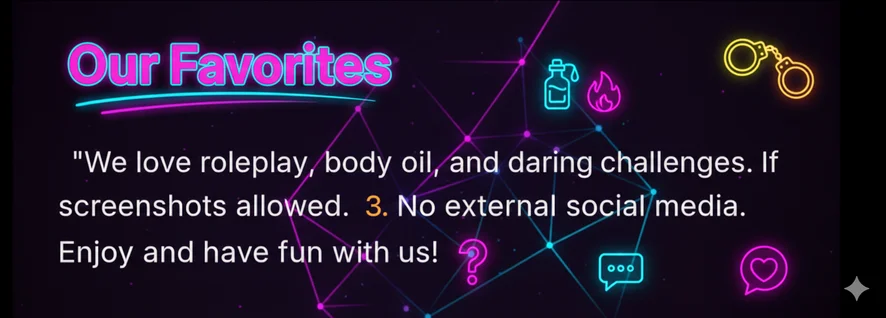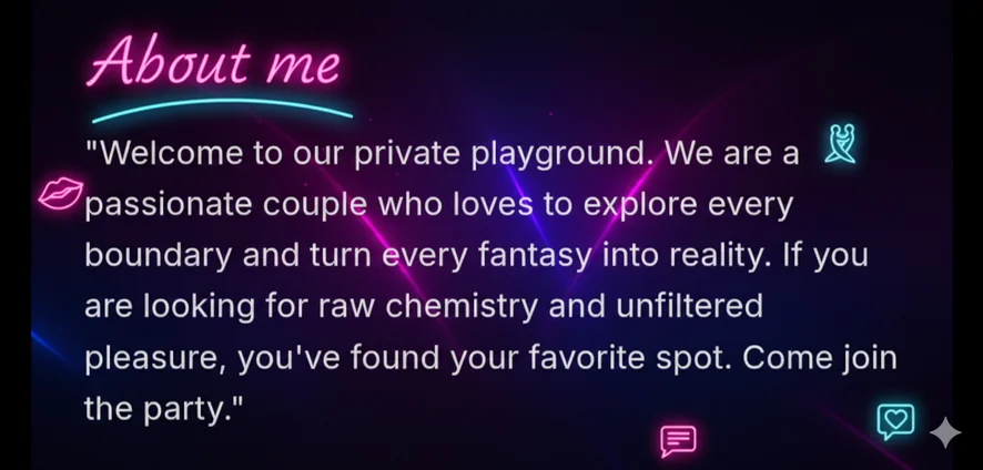 "Welcome to our private playground. We are a passionate couple who loves to explore every boundary and turn every fantasy into reality. If you are looking for raw chemistry and unfiltered pleasure, you've found your favorite spot. Come join the party."